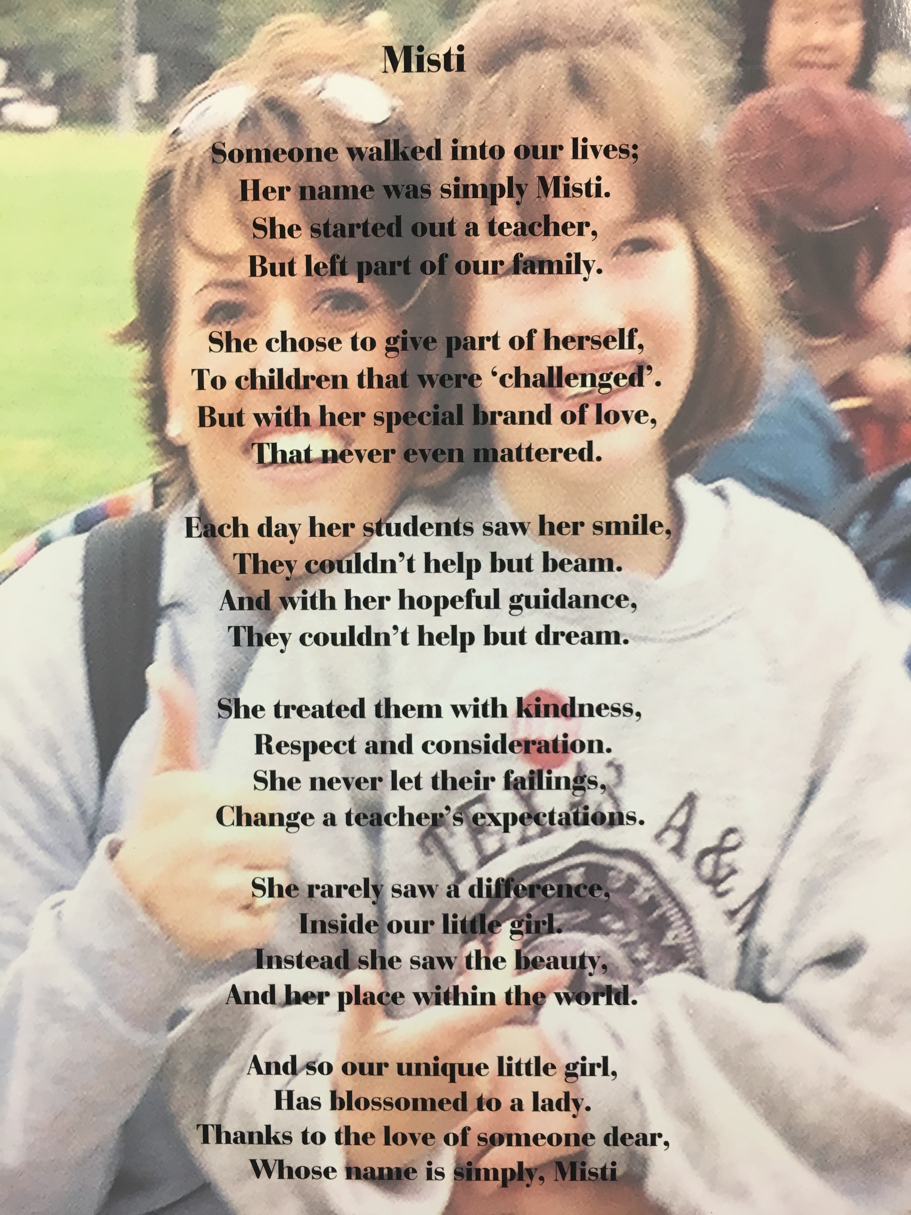 My little girl was ‘growing up’ and changing despite the fact that I didn’t want her to. Misti had helped me realize that she could do so much more than I had ever dreamed. We were lucky to have had her as a teacher for those years at the beginning of ‘the middle’ and they were good. But growing up happens and things always change. Boy and I struggled with so many decisions in our life and with our family. Every major decision had to include, “What about HER? How will this impact HER? Are we doing the right thing for HER?” There were always so many “what-ifs?” Boy grew tired of his job as a police officer and wanted a career change  and that meant a major transition. We packed our bags and headed to another city; leaving behind the comfort of everyone and everything we had known for years. Moving meant finding a new job, a new home, new doctors, new friends and a new support system. It also came along with new fears, new questions and new doubts. How would our family transition and how would our Big Girl deal with all of it? Change was never an easy thing for her and now everything in her world was going to shift. I said goodbye to everyone and choked back tears because I hated leaving the very people that were our heroes, our therapists, our teachers, our doctors, our “orthodontists,” our friends……our family…… and most of all…….I hated saying goodbye to the very people that had been my safety net for so many years.